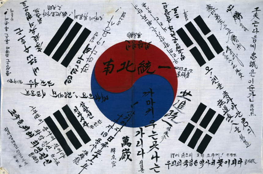 전쟁에 나가기 전에 각자의 소감을 적은 태극기로